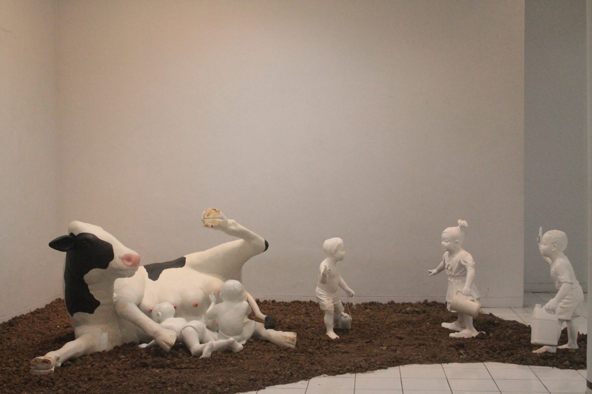 Melangkah memasuki Bentara Budaya, pengunjung akan disuguhkan patung yang di sisi barat ruangan. Ada seekor sapi betina yang disedot susunya oleh empat orang anak manusia. Dua di antaranya menyedot susu si induk, dan dua lainnya dengan sabar menunggu sembari membawa ember. “Anak-Anak Sapi”, begitu judulnya. Amboro Liring, sang seniman, menggambarkan kelegowoan dan keikhlasan hati “Aku Rapopo” melalui induk sapi yang tetap gembira meskipun susunya disedot habis oleh anak-anak tersebut.