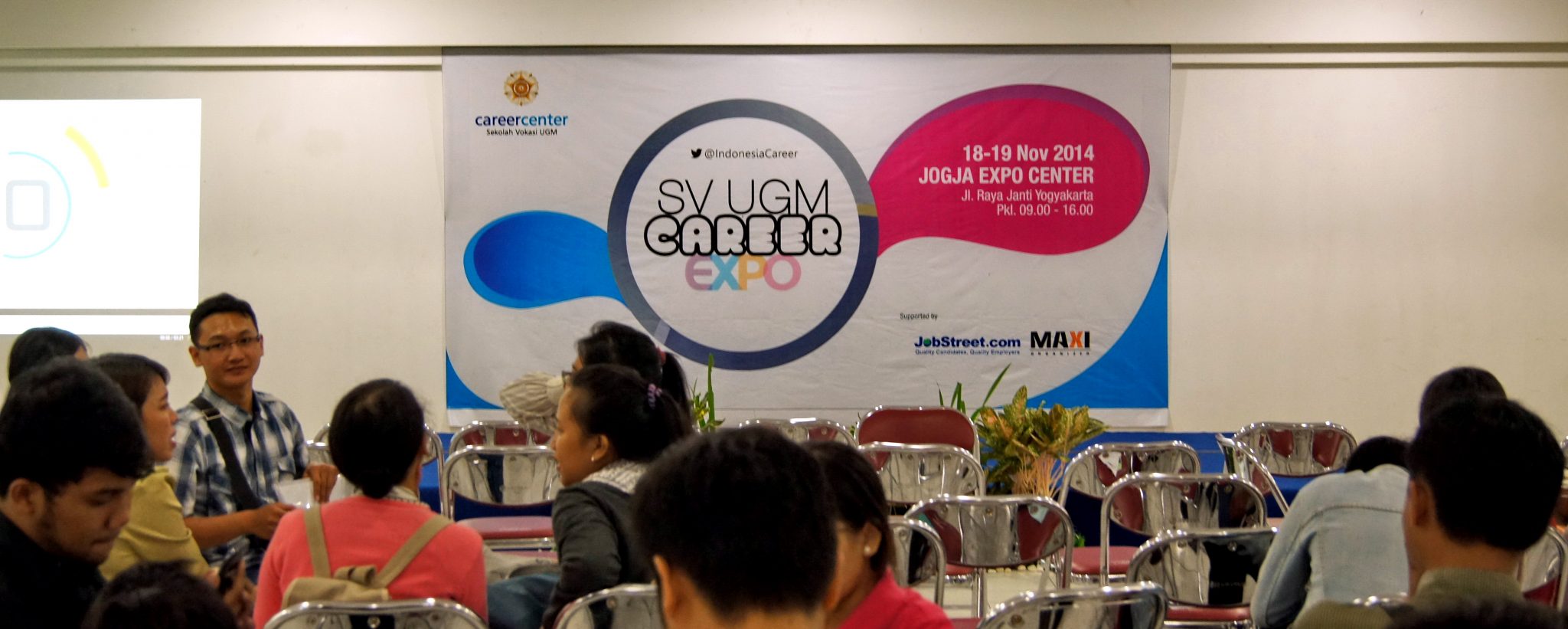 Ribuan orang memadati Jogja Expo Center (JEC). Mereka datang menghadiri acara Indonesia Career Expo (ICE). ICE diselenggarakan oleh Career Center Sekolah Vokasi UGM. Acara ini berlangsung selama dua hari, yaitu dari 18-19 November 2014. Kegiatan ini diadakan setiap tahunnya, yaitu pada November. Ini kali kedua ICE terselenggara.