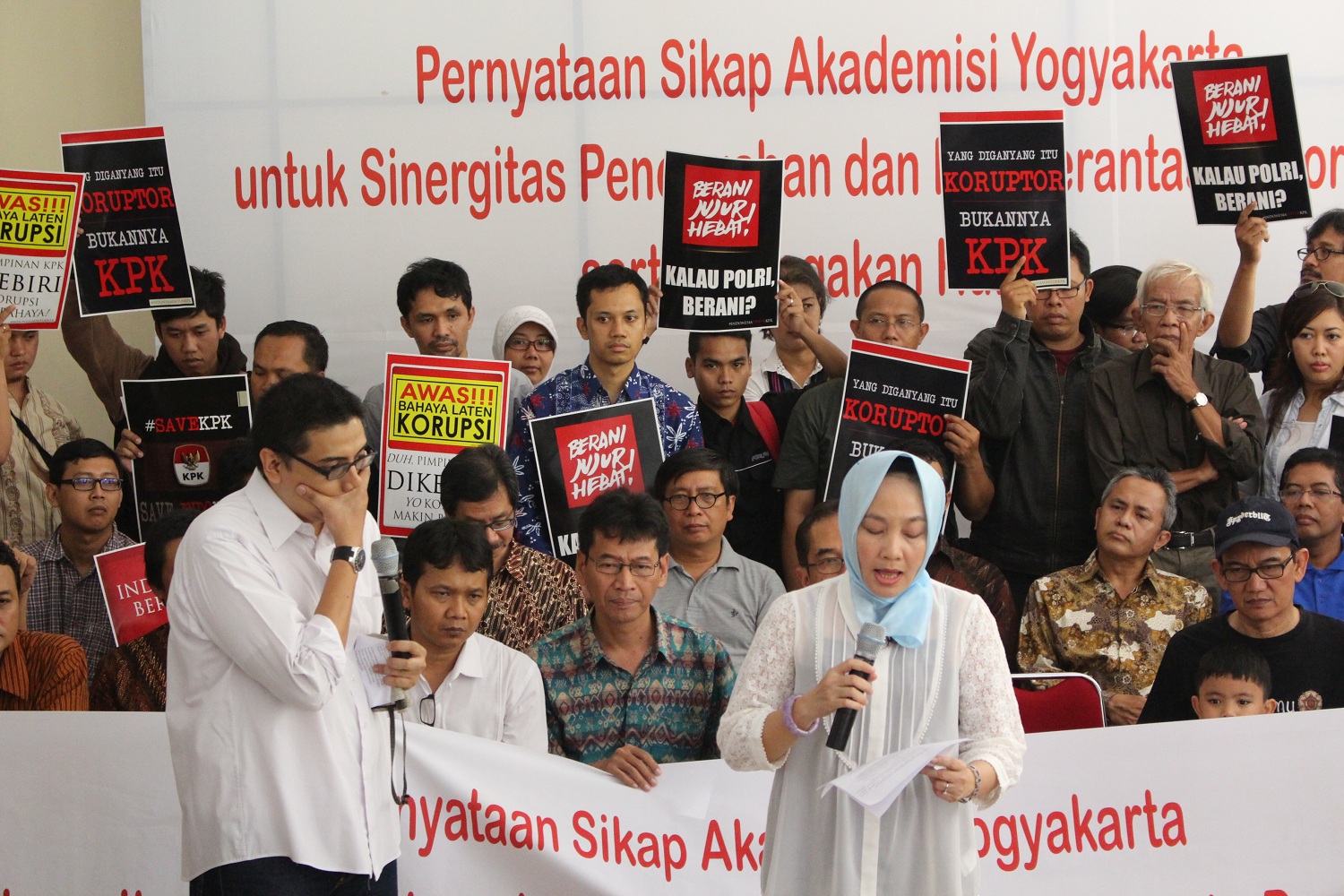 “Upaya pemberantasan korupsi terhadap penegak hukum lain selalu mendapatkan serangan balik,” keluh DR. Zainal Arifin Mochtar, S.H., LLM. pada Minggu (25/01). Ketua Pusat Kajian Anti Korupsi (PUKAT) Fakultas Hukum (FH) UGM ini didaulat untuk memandu acara pernyataan sikap akademisi Yogyakarta mengenai Sinergitas Pencegahan dan Pemberantasan Korupsi serta Penegakan Hukum. Walau mengatasnamakan akademisi, acara ini turut dihadiri anggota masyarakat dari berbagai golongan. Acara yang diadakan di lantai dasar sayap utara Balairung Rektorat UGM ini merupakan rangkaian dari acara aksi yang dilakukan di Markas Besar Kepolisian Daerah (Mapolda) DIY kemarin (24/01).