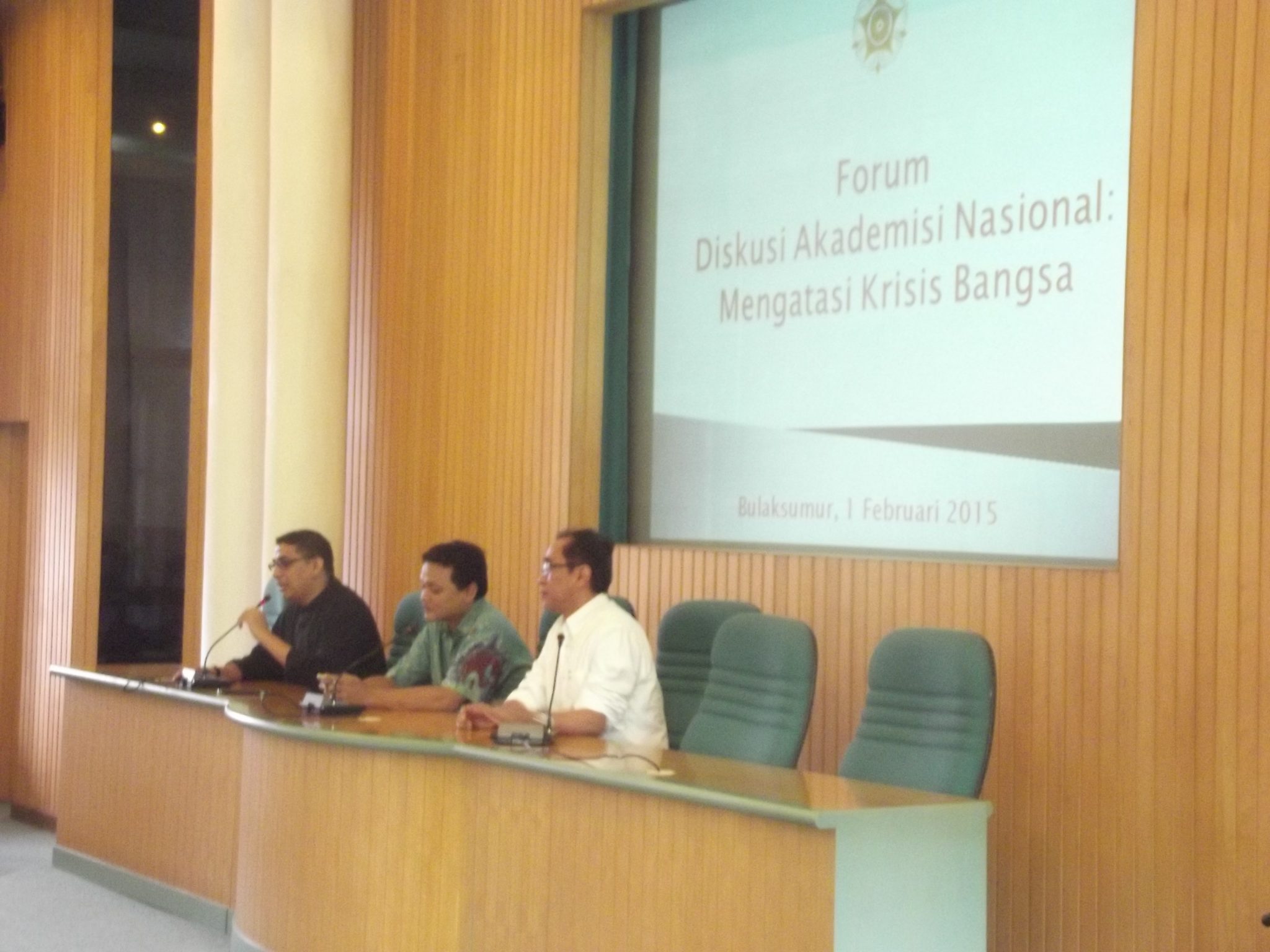 Para akademisi dan pimpinan beberapa organisasi membahas serta menyikapi krisis yang menimpa bangsa baru-baru ini dalam Forum Diskusi Akademi Nasional di Gedung Pusat UGM, Minggu (01/02). Setelah tiga minggu terjadi polemik antara Komisi Pemberantasan Korupsi (KPK) dan Kepolisian Republik Indonesia (Polri), Akademisi Nasional melakukan diskusi kebangsaan di Ruang Multimedia Gedung Pusat UGM guna merespon isu tersebut.  Akademisi Nasional tersebut diwakili oleh Forum Rektor Indonesia, Asosiasi  Perguruan Tinggi Swasta di Indonesia, guru besar dan mahasiswa. Acara yang berlangsung pada Minggu (01/02) tersebut juga dihadiri oleh Ketua dan Sekretaris Tim Sembilan, yaitu Ahmad Syafi’I Ma’arif dan Hikmahanto Juwana. Tim Sembilan merupakan tim independen yang dipercaya Presiden untuk memberikan masukan terkait kisruh KPK-Polri.
