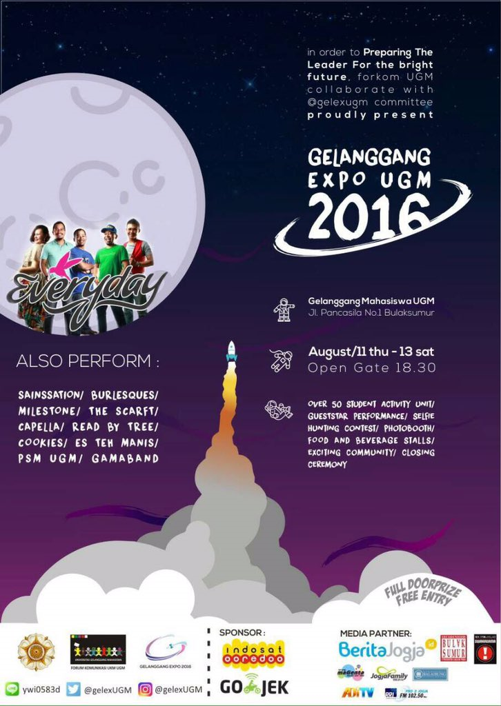 Gelanggang expo tahun ini mengusung tema galaksi (Gelanggang beraksi) yang tentunya akan menggunakan konsep ruang angkasa. Ingin foto bersama astronot? Tentu bisa, akan ada maskot yang berpakaian astronot disini nantinya. Ingin merasakan suasanaa ruang angkasa? Pas banget harus kesini pastinya. Takut HTM mahal? Wah jangan khawatir, gelanggang expo free HTM! Bukan anak UGM? Gak usah khawatir juga, acara ini terbuka untuk masyarakat umum loh. Jadi tunggu apa lagi? Jangan lewatkan gelanggang expo 2016. Nikmati bersama suasana ruang angkasa di kampus tercinta.