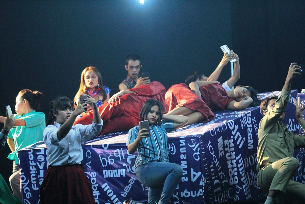 Para aktor dan aktris yang semula bergerak bagai robot kemudian berjalan mengelilingi laki-laki dan perempuan yang tertidur tersebut. Mereka berjalan beriringan sembari memainkan gawai dengan gerakan yang selaras. “Aku dan Liyan disini juga dihadirkan melalui dua tokoh utama, yakni si perempuan dan laki-laki, dengan simbol-simbol masyarakat di luarnya, salah satunya adalah gawai,” terang Basundara.