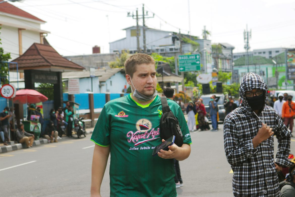 Dari mereka yang terlihat berbeda dari massa aksi, mungkin kehadiran Pablo menjadi yang paling kontras. Pablo merupakan seorang warga negara Polandia yang sedang menempuh pendidikan pascasarjana di Universitas Airlangga. Dirinya mengaku tertarik dengan apa yang disampaikan oleh mahasiswa pada aksi ini. “Permasalahan UU Cipta Kerja ini menurut saya letak kekurangannya ada pada partisipasi publik, jadi mahasiswa merasa kalau mereka kurang mendapat dialog,” ujar Pablo.