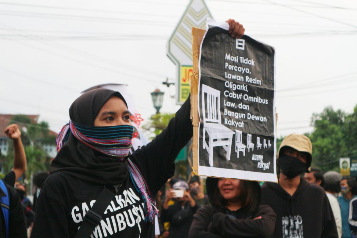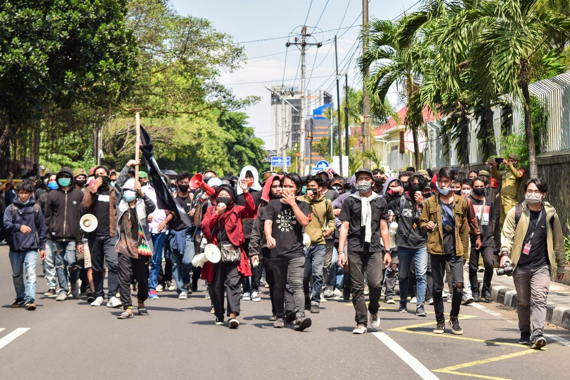 Ratusan massa aksi melakukan longmars dari Gerbang Utama UNY pada Selasa (20-10). Mereka mulai berjalan berbaris sambil bergandeng lengan pada pukul 12.45 WIB. Sepanjang longmars, yel-yel terus didengungkan massa aksi. Beberapa kali terdengar teriakan “Revolusi! Revolusi!” mengiringi perjalanan mereka menuju Bundaran UGM. Massa aksi yang tergabung dari Aliansi Rakyat Bergerak (ARB) terdiri dari berbagai elemen masyarakat sipil di Yogyakarta.