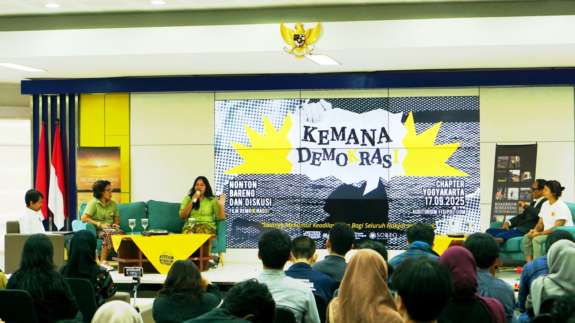Social Research Center (SOREC) bersama Yayasan Madani Berkelanjutan dan Climate Reality Indonesia menyelenggarakan nonton bareng dan diskusi publik yang bertajuk “Kemana Demokrasi?” di Auditorium Fisipol UGM. Diskusi ini menyoroti ketidakadilan iklim dan kelalaian pemerintah dalam agenda pembangunan melalui film bertajuk “DEMO(k)RAS(i)” yang disutradarai oleh Ahsania Aghneta. Diskusi yang diselenggarakan pada Rabu (17/08) ini dipimpin oleh Gregorius Ragil, sekretaris SOREC, sebagai moderator. Turut hadir dalam diskusi tersebut Arifah Handayani, Arami Kasih, dan Andreas Widyanta sebagai panelis.