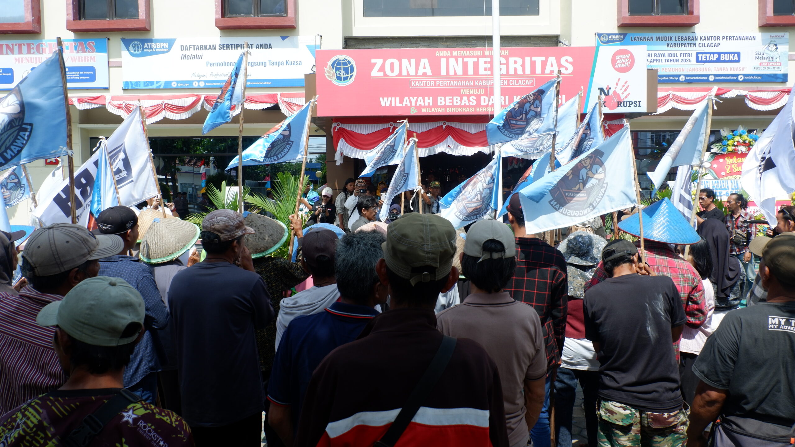 Terik matahari pukul 1 siang pada Rabu (24/09) menyinari massa aksi di halaman Kementerian Agraria dan Tata Ruang/Badan Pertanahan Nasional (ATR/BPN) Kabupaten Cilacap. Bertepatan dengan Hari Tani Nasional, masyarakat Kampung Laut yang tergabung dalam Barisan Tani dan Nelayan Kampung Laut (Bata Laut) menuntut kepastian hukum kepada Kementerian ATR/BPN atas tanah warga yang digusur. “Semestinya mereka [ATR/BPN-red] memberikan kepastian terkait dengan kedudukan warga negara dalam persoalan pertanahan,” tutur Suwandi, perwakilan Lembaga Bantuan Hukum Yogyakarta, saat orasi.