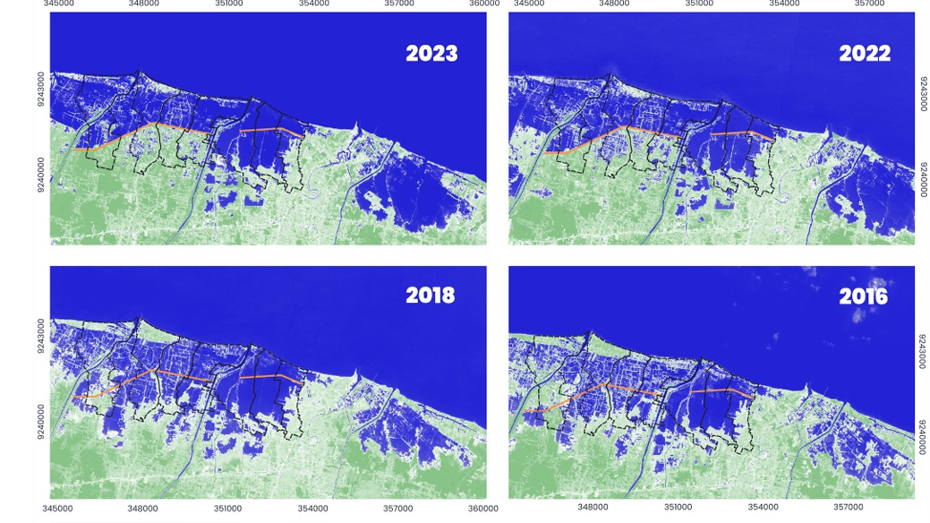 Banjir rob datang bukan tanpa sebab, ia adalah dampak dari penurunan tanah. Berdasarkan data, penurunan tanah (land subsidence) di pesisir pekalongan diperkirakan 20,5 cm pertahunnya (Mous dkk. 2024). Tenggelamnya kawasan pesisir Pekalongan baik wilayah administrasi kota maupun kabupaten terlihat dari citra satelit 2016-2023 yang memperlihatkan hilangnya tutupan hijau sebagai penanda wilayah daratan.