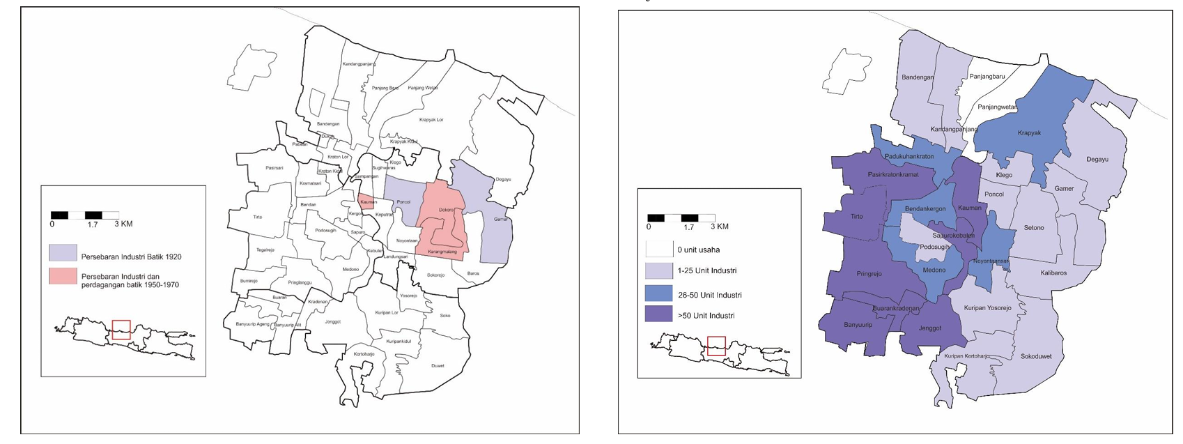 Sumber : digilib.itb.ac.id. Perbedaan peta sebaran industri batik Pekalongan 1920-1970 ( kiri) dan 2014 (kanan)