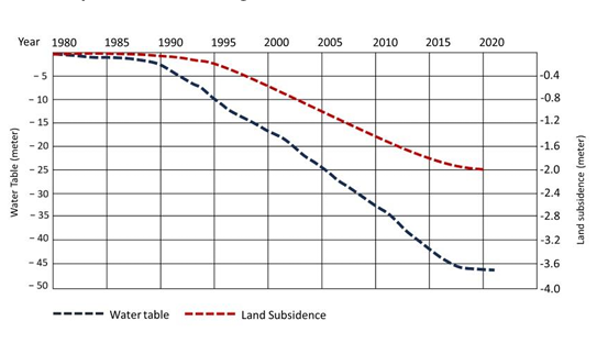 Penurunan ini lebih tinggi dibandingkan dengan Jakarta dan kota pantura lainnya. Hal tersebut disebabkan oleh struktur geologi tanah aluvial yang rentan akibat perubahan iklim. Dampak perubahan iklim ini bukanlah faktor tunggal, pengambilan air tanah yang eksploitatif turut mengakibatkan penurunan tanah (Saputra dkk. 2025). Eksploitasi air berkaitan erat dengan laju aktivitas urbanisasi dan pesatnya perkembangan industri di perkotaan (Saputra dkk. 2025).