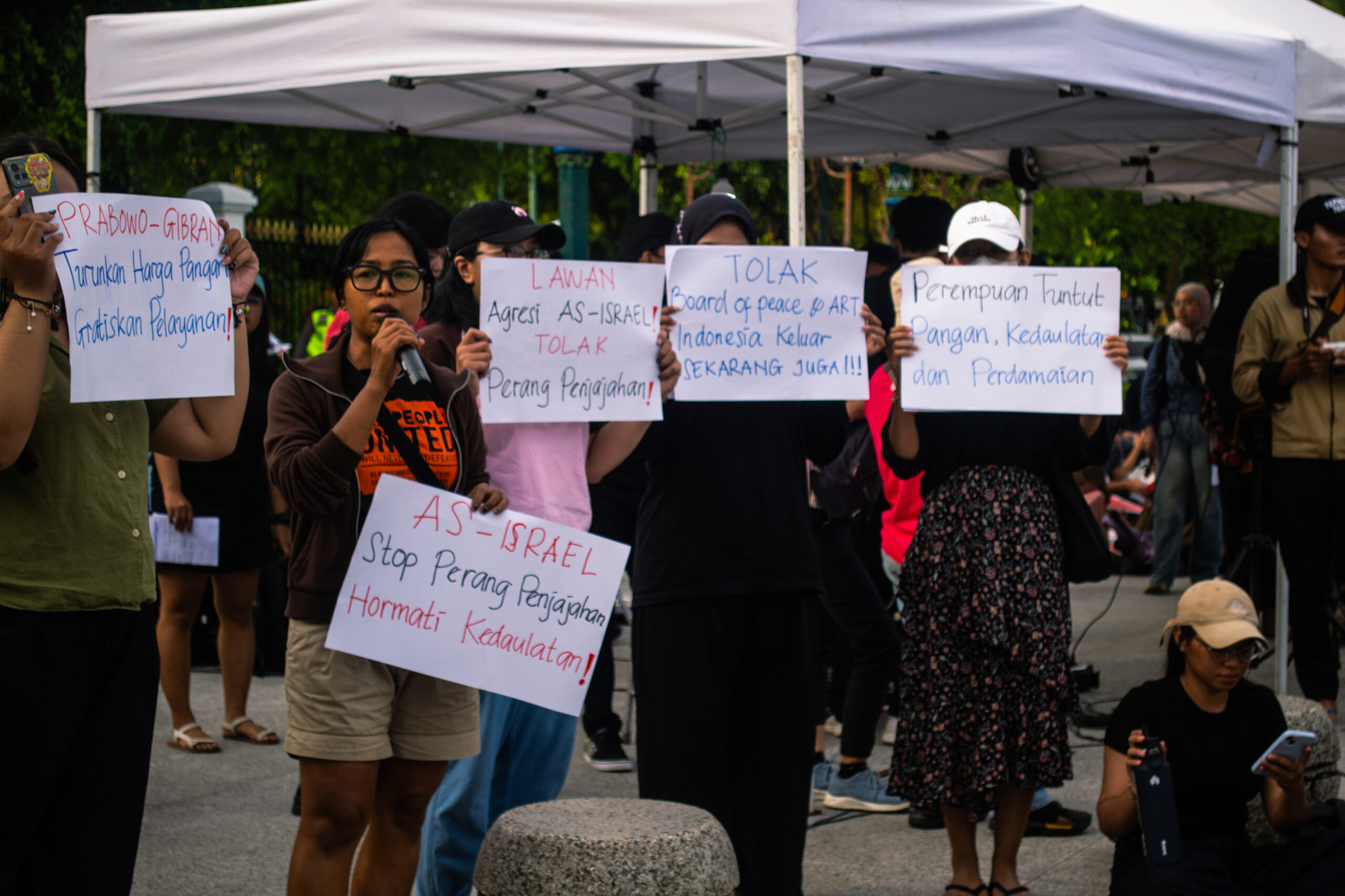 Rini, salah satu moderator aksi, menyebutkan bahwa peringatan Hari Perempuan Internasional tahun ini mengusung tema “Perempuan* Hempaskan Penindasan” dengan landasan feminisme interseksional. Adapun feminisme interseksional yang dimaksud adalah kerangka berpikir yang mengakui identitas sosial yang tidak tunggal dari perempuan, seperti ras, kelas sosial, hingga orientasi seksual. Rini menjelaskan bahwa penggunaan tanda bintang pada kata perempuan* dalam tema IWD merupakan simbol upaya merangkul keberagaman identitas tersebut. “Kan perempuan nggak cuma satu identitas, ya, ada perempuan pekerja. Bekerjanya pun macam-macam, ada yang di kantor, ada yang bekerja sebagai pendidik, ada buruh,” tutur Nana.