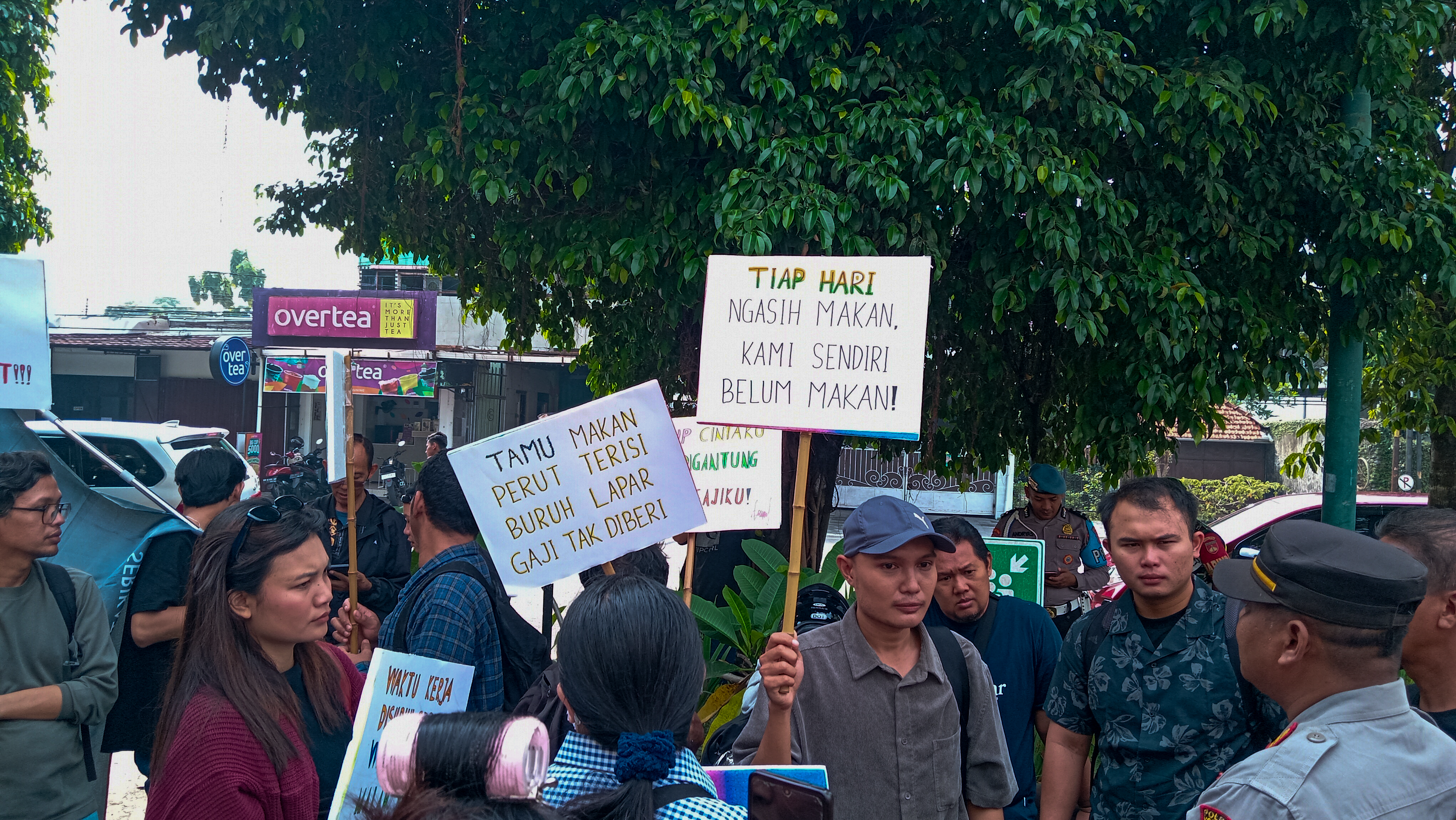 Sejumlah buruh dari Pibee Group, vendor yang bergerak di bidang Food & Beverages, menggelar aksi unjuk rasa di depan Kalya Hotel, Yogyakarta, pada Senin, (06-04). Dalam aksi tersebut, mereka didampingi oleh Lembaga Bantuan Hukum Merdeka Sejahtera (LBH Semesta) dan Federasi Serikat Merdeka Sejahtera (F-SEMESTA) . Aksi ini dipicu oleh keterlambatan pembayaran upah 10 buruh yang telah menuntaskan masa kerjanya di Kalya Hotel.